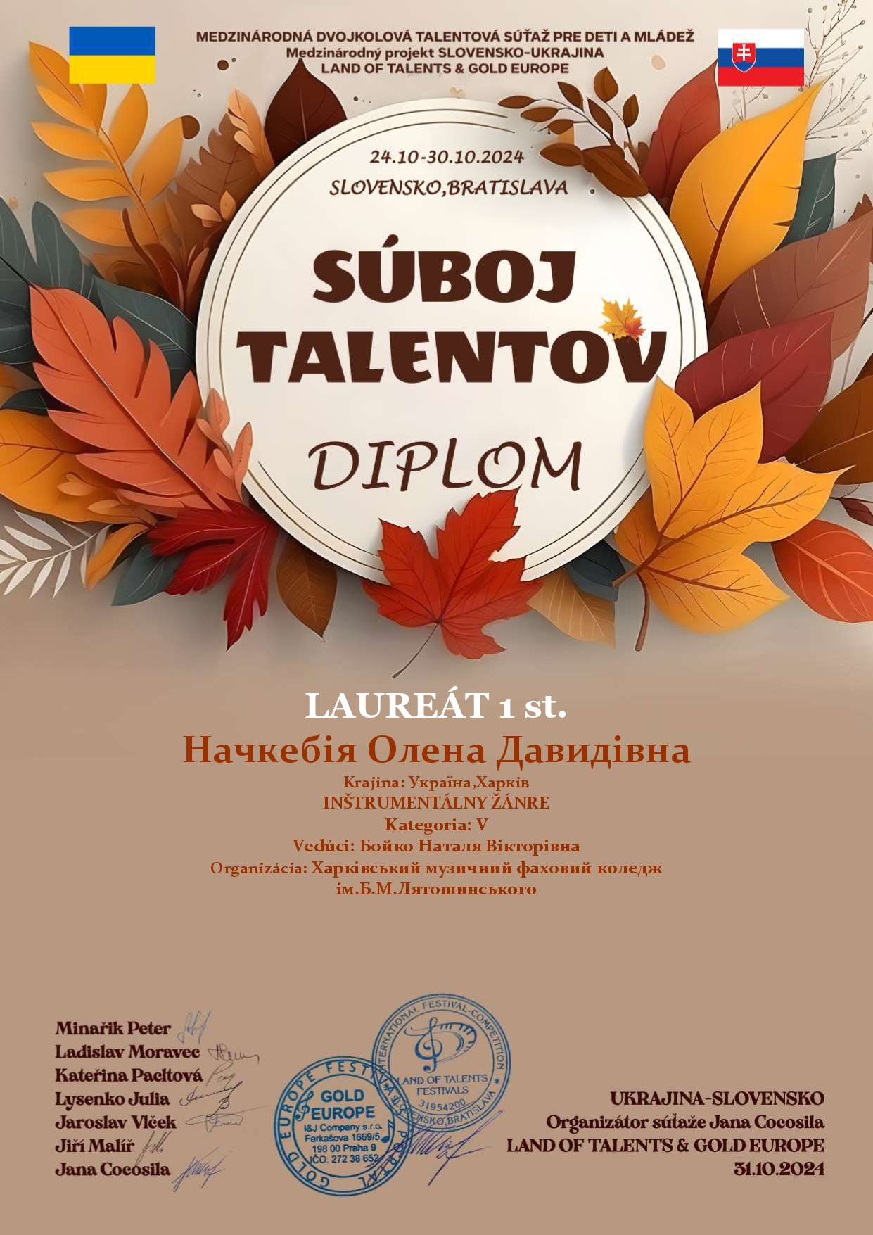 Горбаченко Єлизавета Студентка 4 курсу відділу «Народні інструменти» (клас домри). Є лауреатом багатьох всеукраїнських та міжнародних конкурсів. Впродовж навчання у коледжі бере активну участь у житті коледжу: грає на різноманітних благодійних та звітних концертах, концертах відділу, а також на музичних фестивалях.
